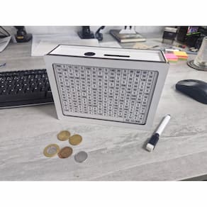 Geralmente, as dimensões da caixa são compactas, facilitando a colocação em ambientes domésticos ou no escritório, ao mesmo tempo que oferece um espaço suficiente para guardar moedas e notas de forma organizada.