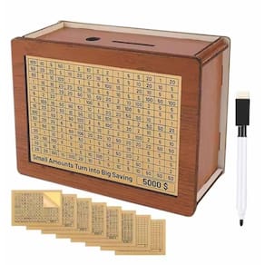 É uma caixa de madeira estilizada e funcional, com design decorativo, usada para armazenar dinheiro de maneira criativa e planejada.