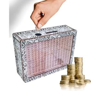 Geralmente, as dimensões da caixa são compactas, facilitando a colocação em ambientes domésticos ou no escritório, ao mesmo tempo que oferece um espaço suficiente para guardar moedas e notas de forma organizada.