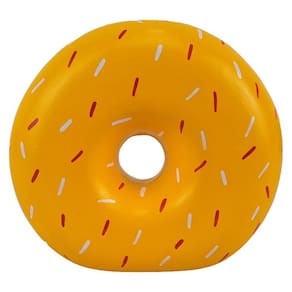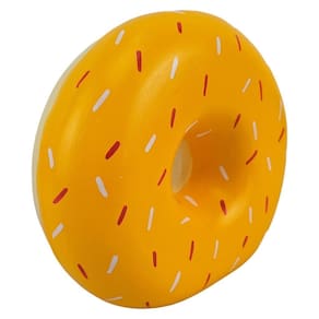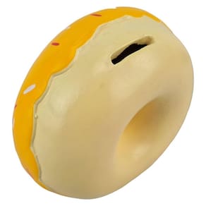 O cofrinho de moedas em formato de rosquinha é um objeto funcional feito de gesso, com um furo em cima para depositar as moedas. É uma forma divertida e criativa de armazenar dinheiro, além de ser um objeto decorativo interessante para a casa ou escritório.