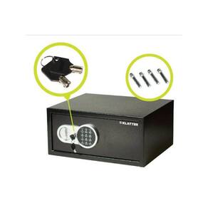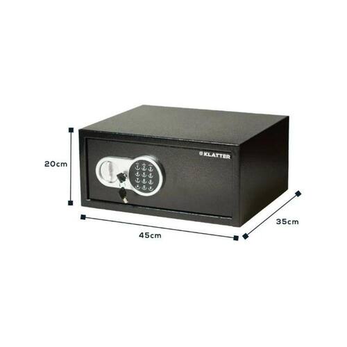 DESCRIÇÃO:Desenho funcional e estético o que o torna perfeito para sua Casa Escritório ou HotelIdeal para guardar objetos de valor como: joias dinheiros documentos passaportes produtos eletrônicos pequenos e NotebookProteção por meio de combinação numérica ajustávelAbertura com chave em caso de emergência ou esquecimento da combinação numéricaPreparado para ser fixado na parede ou pisoMaterial retardador de chamaESPECIFICAÇÕES:Peso : 9,5kgCor: PretoMaterial: FerroDimensões: 43 comprimento x 35 largura x 20 cm alturaTipo de uso: parede ou pisoCapacidade: 22,5 LEspessura das paredes do cofre: 1,5 mmAbertura eletrônica com combinação numérica ajustávelPossui chave para abertura em caso de emergência orifício ocultoPossui dois orifícios para fixação em parede ou piso contém 2 parafusos Use broca de 15 mm para instalaçãoInterior com acabamento diferenciado carpeteAlimentação: 4 pilhas AA não incluídasOrigem: ChinaMarca: KlatterINCLUSO:1 Cofre eletrônico2 Chaves2 Parafusos para fixação na parede