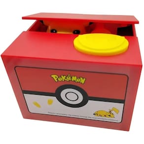 Excelente opção para decorar o ambiente! Cofre automático com um Pikachu Pokémon muito meigo escondido na caixa. Você coloca uma moeda sobre o pratinho e o Pikachu sai da caixa e rouba a moeda. Ótima e divertida maneira de ensinar as crianças a poupar dinheiro e juntar moedas. Fica lindo e chama muito a atenção sobre os balcões de bares, padarias, lojas, ONGs, escritórios, quermesses, secretarias de escola e qualquer outro local que recolha doações ou caixinha para os funcionários. Também estimula a doação para artistas e performers de rua. Um lindo presente para adultos e crianças. Para tirar as moedas é só abrir o compartimento embaixo. Funciona com duas pilhas pequenas (AA).