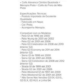 Descrição do produto Coifa câmbio alavanca freio mão bola palio 1996 a 2011 kit Mais informações Marca: 5259374 Descrição completa Descrição do produto Coifa câmbio alavanca freio mão bola palio 1996 a 2011 kit Mais informações Marca: 5259374 Descrição completa Coifa câmbio alavanca freio mão bola palio 1996 a 2011 kit Linha fiat: Coifa alavanca câmbio quadrada + manopla Cinza + coifa do freio de mão preta Especificações técnicas: - produto de excelente qualidade; - fabricado em napa; - cor: preta; - acompanha manopla. Compatível com os modelos: - palio g1 de 1996 até 2000 - palio young de 2001 até 2002 - palio g2 de 2001 até 2006 - palio g3 celebration de 2008 até 2010 interior g2 - palio g3 economy de 2011 até 2014 interior g2 - siena g1 de 1998 até 2000 - siena g2 de 2001 até 2006 - siena g3 celebration de 2008 até 2012 interior g2 - strada g1 de 1999 até 2001 - strada g2 de 2001 até 2006 - palio weekend g1 de 1997 até 2000 - palio weekend g2 de 2001 até 2004 Não serve nas versões g3 ex, g3 el, g3 elx, g3 hlx, e linha g4. Importante: - o valor ao kit - 1 mês - o produto é enviado com . Agradecemos a sua visita Agradecemos a sua visita Marca: Não Informado
