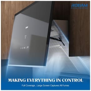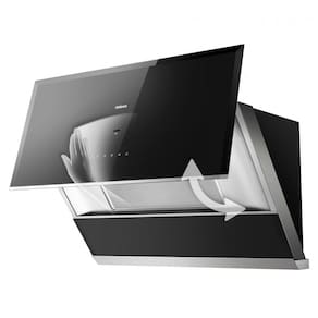 A coifa de embutir sob armário ou parede Robam de 76 cm na cor preta é indicada para cozinhas residenciais com fogões de 30 polegadas, oferecendo exaustão em sistemas com duto. O equipamento combina corpo em aço inoxidável com painel frontal em vidro temperado preto, formando uma área de captação adequada para remoção de fumaça, gordura e odores em uso diário.