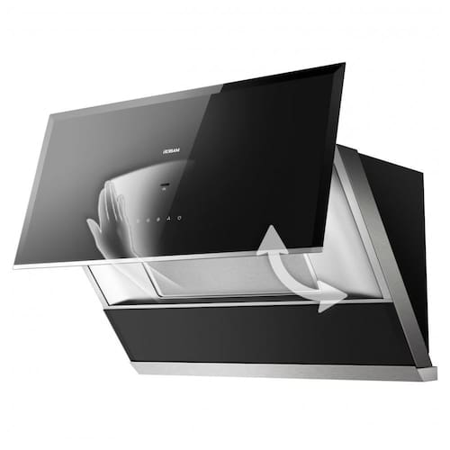 Recursos e tecnologias: Motor brushless, controle por gestos e toque, 3 velocidades de exaustão, função de desligamento automático com atraso, área de captação otimizada, iluminação LED, painel em vidro temperado