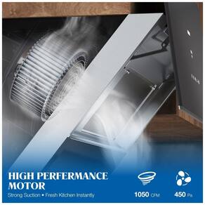O sistema de ventilação utiliza motor brushless com vazão de 1050 CFM e pressão estática de 450 Pa, dimensionado para extração de fumaça em diferentes níveis de intensidade de cocção. A coifa dispõe de três velocidades de funcionamento e comando por toque e por gestos, permitindo ligar, desligar e alternar os estágios de exaustão sem contato direto com o painel de controle, o que favorece o uso com mãos úmidas ou engorduradas.