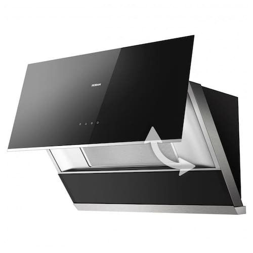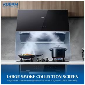 A coifa de embutir sob armário ou parede Robam de 76 cm na cor preta é indicada para cozinhas residenciais com fogões de 30 polegadas, operando em sistema com duto para exaustão de fumaça e odores. A estrutura combina corpo em aço inoxidável com painel frontal em vidro temperado preto, formando uma zona de captação adequada para uso diário em cozinhas de pequeno e médio porte.