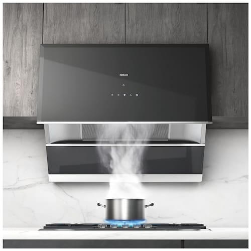 A coifa de embutir sob armário ou de parede Robam de 76 cm na cor preta foi projetada para exaustão em cozinhas residenciais, combinando corpo metálico com frente em vidro temperado deslizante. O design de extração lateral com painel em vidro frontal aumenta a área de captura sobre o cooktop, permitindo uso tanto em instalação sob armário quanto diretamente na parede, com duto de exaustão superior compatível com diâmetro de 15,2 cm.