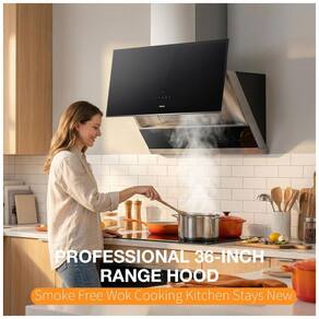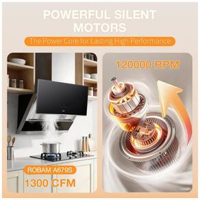 A coifa de embutir sob armário ou parede Robam de 91 cm na cor preta é indicada para cozinhas residenciais com fogões de 36 polegadas que exigem exaustão de alta capacidade em sistemas com duto. O equipamento combina corpo em aço inoxidável com painel frontal em vidro temperado preto, formando uma área de captura ampla para remoção de fumaça, gordura e odores ao longo de toda a superfície de cocção.