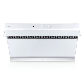 Esta coifa de cozinha foi projetada para instalação sob gabinete ou na parede, com design inclinado que direciona a sucção próxima à área de cocção para capturar fumaça e vapores de forma eficiente em fogões de 5 a 6 queimadores. A estrutura combina aço inox com vidro temperado branco, com placa de captura que se abre em ângulo de 90° para melhorar o fluxo de ar.