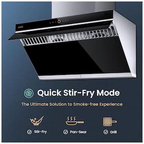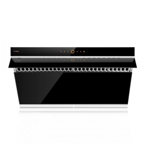 Recursos e tecnologias: Motores DC duplos, placa de captura com abertura automática a 90°, comando por toque, ativação por movimento, 4 velocidades, função desligamento automático, iluminação LED, filtros baffle metálicos removíveis, bandejas coletoras de gordura