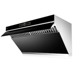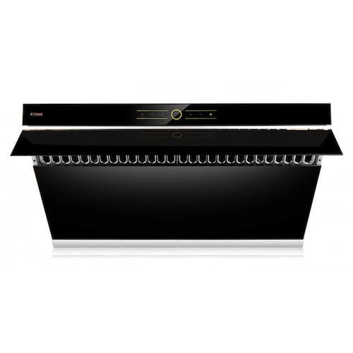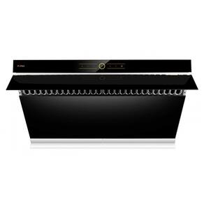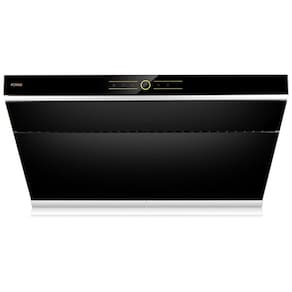 Recursos e tecnologias: Design inclinado de sucção, placa de captura com abertura automática a 90°, motores centrífugos, 3 velocidades, função desligamento automático com atraso, função de travamento da tela, iluminação LED, filtro metálico tipo baffle removível, coletor de gordura