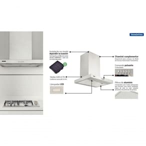- Tensão: 220 V;- Velocidades: 3;- Comando: Pulsante;- Frequência: 50 - 60 Hz;- Potência Máxima: 260 W;- Filtro Metálico Lavável: 2;- Iluminação: 2 lâmpadas led (2 x 1,5 W);- Filtro de Carvão: 1-Modelo Ambifresh 1;- Vazão: 620 m/hora - cfe. Norma IEC 61591;- Nível de Ruído: 63 db(A) - cfe. Norma IEC 60704;- Distância da mesa do cooktop para instalação: Mínima 65 cm e máxima de 75 cm. - A coifa oferece um motor que acompanha um dispositivo de desligamento automático em casos de superaquecimentoAcessórios Inclusos:- Kit para instalação;- 1 Filtros de carvão ativado AmbiFresh;- Não acompanha tubo flexivel. Ean: 7894693045164