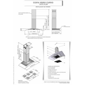 As dimensões do produto podem sofrer uma pequena variação de largura do vidro, de até 7 sete milímetros. Por este motivo, quando a coifa for instalada de forma embutida em nichos, o fabricante recomenda que seja considerada uma folga de pelo menos 1 cm em cada lado