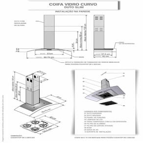 As dimensoes do produto podem sofrer uma pequena variacao de largura do vidro, de ate 7 sete milimetros. Por este motivo, quando a coifa for instalada de forma embutida em nichos, o fabricante recomenda que seja considerada uma folga de pelo menos 1cm em cada lado