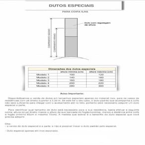 Para cozinhas com pé direito superior a 2,55 m. Temos disponível para venda à parte, alguns tamanhos de dutos especiais. Nas imagens do anúncio disponibilizamos a informação das medidas dos dutos especiais.