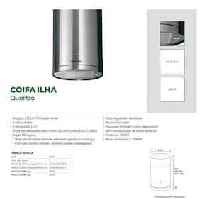 Com Seu Desing Elegante e Requintado, a Coifa Ilha Quartzo Redonda Conta com Uma Iluminação com 2 Lâmpadas de Led, Além do Seu Incrível Acabamento em Aço Inox 304 Que Garante Mais Resistência À Corrosão o Que a Torna Eficiente, e Muito Sofisticada.