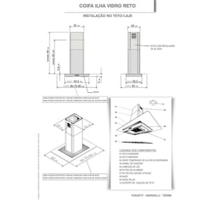 As dimensões do produto podem sofrer uma pequena variação de largura do vidro, de até 7 sete milímetros. Por este motivo, quando a coifa for instalada de forma embutida em nichos, o fabricante recomenda que seja considerada uma folga de pelo menos 1 cm em cada lado