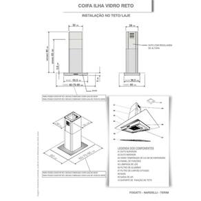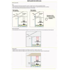 As dimensões do produto podem sofrer uma pequena variação de largura do vidro, de até 7 sete milímetros. Por este motivo, quando a coifa for instalada de forma embutida em nichos, o fabricante recomenda que seja considerada uma folga de pelo menos 1 cm em cada lado