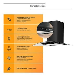 Elegante e funcional, esta coifa de parede de 90 cm e ideal para fogoes de 5 e 6 bocas. Com acabamento preto e painel de vidro, adiciona um toque moderno a cozinha enquanto proporciona eficiencia na eliminacao de fumaca e odores. Opera com tensao eletrica de 127V e potencia de 65 W. Possui tres velocidades ajustaveis, facilitando o controle conforme sua necessidade. Inclui lampadas para melhor visibilidade e filtro de carvao, que auxilia na purificacao do ar. A estrutura combina metal e vidro, recomendando-se limpeza com agua morna, esponja macia e sabao neutro para maior durabilidade. Medidas: 42,6 cm de altura, 89,5 cm de largura e 47 cm de profundidade. Acompanha chamine e oferece 12 meses de contra defeitos de fabricacao. Marca: Não Informado Ean: 7892162166921