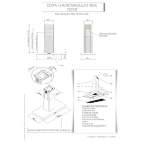 Coifa Terim Ilha / Teto Retangular Inox 120 Cm Inox 220v Deixe sua cozinha mais moderna com a Coifa de Ilha Retangular da Terim. Alem de pratica e bonita, possui a base e dutos em inox e acompanha filtro de aluminio e filtro de carvao ativado. A coifa pode ser instalada de dois modos distintos, como exaustor ou como depurador. Com design diferenciado, que facilita sua limpeza, iluminacao com lampadas de led e tres velocidades. Traga mais versatilidade para sua cozinha. Para Fogao cooktop de 4 bocas e indicado coifa de 60 ou 70 cm Para Fogao cooktop de 5 bocas e indicado coifa de 75, 80 ou 90 cm Para Fogao cooktop de 6 bocas e indicado coifa de 90 cm ou mais Observacao importante, sempre observar a largura do seu fogao, para que a largura da coifa seja sempre um pouco maior que o fogao cooktop