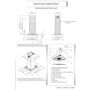 As dimensoes do produto podem sofrer uma pequena variacao de largura do vidro, de ate 7 sete milimetros. Por este motivo, quando a coifa for instalada de forma embutida em nichos, o fabricante recomenda que seja considerada uma folga de pelo menos 1 cm em cada lado