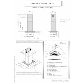 As dimensões do produto podem sofrer uma pequena variação de largura do vidro, de até 7 sete milímetros. Por este motivo, quando a coifa for instalada de forma embutida em nichos, o fabricante recomenda que seja considerada uma folga de pelo menos 1 cm em cada lado