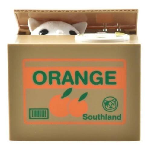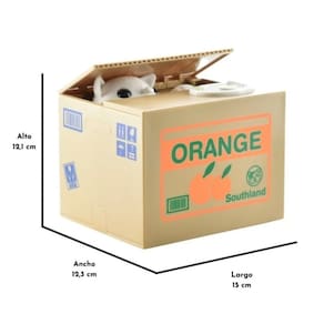 Salve-se de se divertir!. Dentro da caixa está o gatinho que quando você coloca a moeda e pressiona suavemente, ela sai rapidamente, pega sua moeda e a salva para ajudá-lo a economizar. Além de agradecer, ele produz sons e movimentos muito reais. O gato faz “miar” enquanto pega a moeda. Ao colocar a moeda, pressione levemente e verá como o macaco fica de uma forma curiosa Características: -Cofrinho rouba moedas.- Ideal para os menores. -Recomendado para crianças acima de 6 anos. -- Deixe sua moeda no peixe e o gato roubará sua moeda. -Usa 2 pilhas AA.