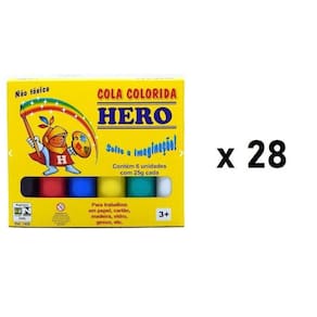 Cola colorida 6 cores tinta escolar lavável kit com 28un de 6 cores total 168 unidades de cola colorida de 25 gramas em cada desenvolvida para trabalhos escolares ,artesanais e aplicações artísticas fabricado por: kit / hero ideal para ser utilizado em material como papel, tela, madeira, couro, cartolina, vidro, porcelana, fórmica, entre outros. Cada caixa com 6 cores: amarelo, vermelho, verde, azul, preto, branco