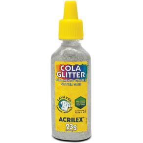 Cola Com Glitter Tubo 23G. Prata Cola Glitter Acrilex Foi desenvolvida para trabalhos escolares e artesanais. Perfeita para atividades de desenvolvimento artístico. Possui um exclusivo bico aplicador que facilita a pintura, podendo ser Utilizado também com esponja ou pincel, para fazer colagens, decorar e pintar sobre papel, papel cartão e cartolina. Não é tóxica, lavável e possui brilho intenso Marca: Não Informado Ean: 7891153006352