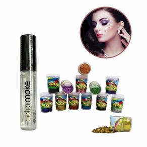Cola gliter 12 cor maquiage festa fantasia carnaval Cola para glitter líquida 6ml incolor maquiagem artistica e glitter cores . Cola e glitter, para fazer aquele make incrível. A cola tem fórmula leve e incolor desenvolvida para proporcionar brilho intenso, longa duração e secagem rápida, sem causar o indesejado efeito craquelado. Isso permite que você alcance um resultado surpreendente em sua make, fácil aplicação, após aplicação use glitters para dar brilho e beleza em sua maquiagem. O kit contém: 1 cola de 6ml. 12 potes de glitter 3g cada cores . Modo de uso Com auxílio do aplicador, coloque uma pequena quantidade do fixador sobre a ele, deposite o glitter e espere secar. Precauções: não ingerir, manter fora do alcance de crianças, não aplicar sobre a pele irritada ou lesionada. Ao sinal de qualquer irritação suspender o uso do produto. Como remover Demaquilante. Marca: Não Informado