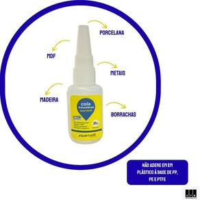 É indicado para colagem e reparo de materiais como: Borracha; Madeira; MDF; Metais; Porcelana; Plástico. Embalagem: disponível em frasco de 20g.