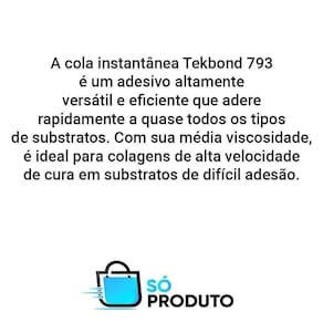 A Cola Instantânea Antientupimento 793 100G Tekbond é um adesivo altamente versátil e eficiente que adere rapidamente a quase todos os tipos de substratos. Sua média viscosidade torna-a ideal para colagens de alta velocidade de cura em materiais porosos, como compostos de borracha, epdm, borracha nitrílica, neoprene, eva e viton.