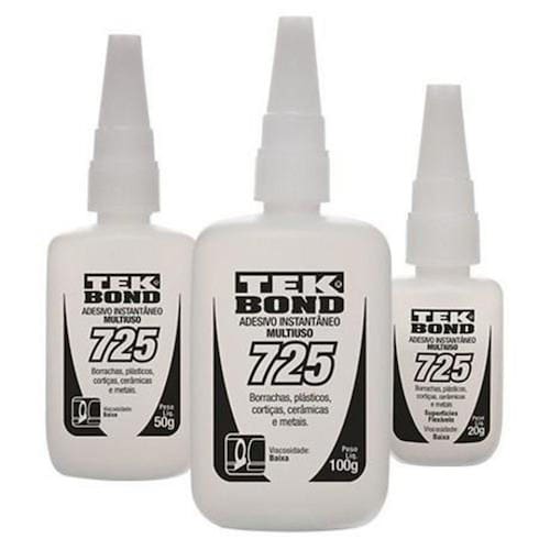 Cola Instantânea 20 gr Tekbond 725 - 01 unidadeAplicação:Indicado para superfícies flexíveis.Adere uma ampla variedade de metais, plásticos, borrachas e outros materiais.EAN 7898904869778Características:É um adesivo à base de cianoacrilato desenvolvido para colagens que necessitamde alta velocidade de cura e excelente resistência.É um produto monocomponente e não requer mistura.O processo de cura inicia-se quando uma fina camada de adesivo é aplicadaentre as superfícies, entrando em contato com a umidade do ar atmosférico.Modo de Uso:Deve-se aplicar uma camada fina de adesivo em apenas 1 um dossubstratos a serem colados, pois o excesso prejudica o bomdesempenho da colagem.Após aplicação do adesivo, devem-se manter as peças pressionadas poraproximadamente 20 segundos, quando a cura inicial estará concluídae a peça poderá ser manuseada com segurança.A cura total ocorrerá em 24 horas.Este adesivo é indicado para folgas de até 0,06mm.Precauções:O excesso de cola prejudica a colagem.Cola a pele e olhos em pouco segundos.Mantenha fora do alcance das crianças.DADOS TÉCNICOS:Viscosidade cP : 40 a 60Temperatura de Trabalho ºC : -55 a 80Preenchimento de Folgas mm : Até 0,06Resistência ao Cisalhamento Aço x Aço : >= 100Kgf/cm2