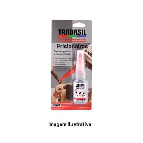 Cola Trava Rosca Alta Resistencia Ra3 Vermelho 15G-TrabasilTorque alto com desgaste. Para prisioneiros e parafusos de grandes diâmetros e/ou desgastados. Desmontagem com ferramentas de alta força.Cor: Vermelha Peso: 15g Tipo: BlisterFolga Máxima Diametralmm 0,45Viscosidade mPa.S Líquido viscoso 7000TorqueQuebra N.M30-45 Residual N..M25-35 Tempo de CuraParcial Min Total Hrs5-20 6