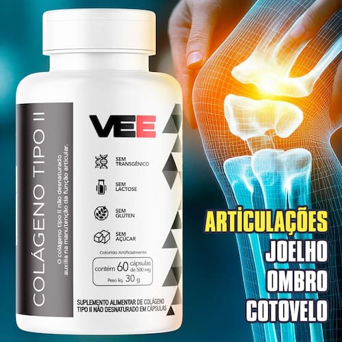💪 Colágeno Tipo II VEE Suplemento premium que auxilia na manutenção da saúde das articulações, ideal para quem sente dores, rigidez ou desconforto ao se movimentar.