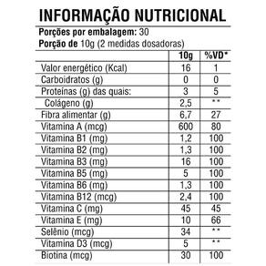 Ingredientes: Peptídeos bioativos de colágeno hidrolisado com peso molecular de 2kDa Verisol , Biotina, Vitamina A, Vitamina B1, Vitamina B2, Vitamina B3, Vitamina B5, Vitamina B6, Vitamina B12, Vitamina C, Vitamina D3, Vitamina E, Selênio, Zinco, Polidextrose e antiumectante dióxido de silício. Não contém glúten. Não contém lactose.