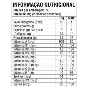 Ingredientes: Peptídeos bioativos de colágeno hidrolisado com peso molecular de 2kDa Verisol , Biotina, Vitamina A, Vitamina B1, Vitamina B2, Vitamina B3, Vitamina B5, Vitamina B6, Vitamina B12, Vitamina C, Vitamina D3, Vitamina E, Selênio, Zinco, Polidextrose, extrato de manjericão, aroma idêntico ao natural de maracujá, acidulante ácido cítrico, antiumectante dióxido de silício e edulcorante glicosídeo de esteviol. Não contém glúten. Não contém lactose.