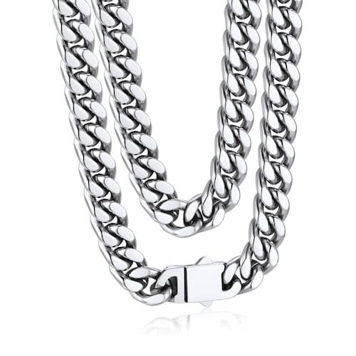 Bandmax Colar masculino de corrente de aço inoxidável 5/7/9/12 mm Chunky Miami Cuban Link corrente pulseira prata/ouro/preto correntes para homens 45.7 cm-76.2 cm, Sem Pedra Preciosa - Coleção de correntes cubanas de Miami. Esta coleção inclui colares de corrente e pulseiras. O design apresenta corrente cubana espaçosa e fecho dobrável elegante. Superfícies altamente polidas refletem um brilho atraente, oferecemos mais tamanhos para escolher. - Material de alta qualidade Material de alta qualidade: SEM LIGA SEM COBRE---Feito com aço inoxidável 316L durável, banhado a ouro 14K/banhado a preto, sem desbotamento de cor, amigável à pele, você sentirá o peso e a textura. - Tamanho disponível: Largura de 5 mm/7 mm/9 mm/12 mm; Comprimento do colar de 45.7 cm/50.8 cm/55.9 cm/61.0 cm/66.0 cm/71.1 cm/76.2 cm; Comprimento da pulseira de 19.0 cm/21.0 cm/22.9 cm. - Esta corrente cubana ousada cobre os tamanhos básicos masculinos e femininos, e o visual bem feito adiciona pontos em festas, reuniões casuais, férias e mais ocasiões. Será um presente de surpresa para o Dia dos Pais, Aniversário, Natal, Aniversário, Formatura, Dia das Bruxas ou qualquer momento comemorado. - Embalagem requintada. Vem com uma caixa de presente da marca Bandmax + uma bolsa de veludo preto, aparência geral minimalista e de alta classe.