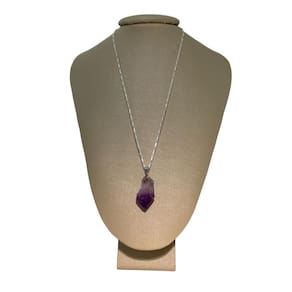 Este pingente de ametista exibe uma beleza estonteante, com nuances de roxo profundo e contornos naturais que destacam a sua origem terrena e a habilidade artesanal na sua montagem.