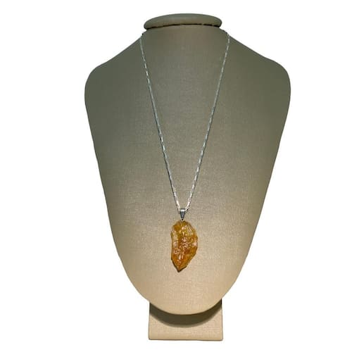 O pingente de citrino brilha com a luminosidade do sol capturada em cristal, apresentando uma forma orgânica que realça a riqueza natural da pedra. Sua montagem simples destaca a beleza inata e a cor vibrante da gema.