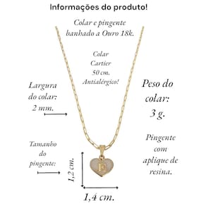 Colar feminino modelo Cartier com pingente Coração branco letra inicial E banhado em Ouro 18k. Delicado e cheio de significado, este colar apresenta um pingente em forma de coração, personalizado com a letra inicial. O colar perfeito para quem deseja manter alguém especial sempre perto do coração. Ideal para presentear ou para adicionar um toque pessoal ao seu estilo diário. Este colar banhado a Ouro é mais que um acessório; é uma declaração de amor. Especificações: Colar Cartier com pingente Coração Branco letra inicia E banhados em Ouro 18k. Tamanho do colar: 50 cm. Peso do colar: 3 g. Espessura do colar: 2 mm. Fecho do colar: lagosta. Antialérgico. Tamanho do pingente: 1,4 x 1,2 cm. Pingente banhado a Ouro com aplique de resina branca. Instruções de uso e conservação: Nossas peças são de excelente qualidade. Para manter o brilho e a beleza da joia; por favor siga estas dicas: Evite o uso da joia durante o banho, ter atenção ao aplique de cremes ou perfumes sobre a joia, evitar banho de piscina e mar com a joia; limpe-as sempre com flanela adequada, guarde-as separadamente. Com estes cuidados básicos a joia manterá sempre a originalidade e qualidade.