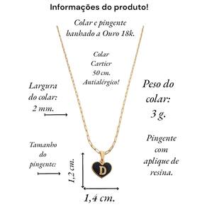 Colar feminino modelo Cartier com pingente Coração negro letra inicial D banhado em Ouro 18k. Delicado e cheio de significado, este colar apresenta um pingente em forma de coração, personalizado com a letra inicial. O colar perfeito para quem deseja manter alguém especial sempre perto do coração. Ideal para presentear ou para adicionar um toque pessoal ao seu estilo diário. Este colar banhado a Ouro é mais que um acessório; é uma declaração de amor. Especificações: Colar Cartier com pingente Coração Negro letra inicia D banhados em Ouro 18k. Tamanho do colar: 50 cm. Peso do colar: 3 g. Espessura do colar: 2 mm. Fecho do colar: lagosta. Antialérgico. Tamanho do pingente: 1,4 x 1,2 cm. Pingente banhado a Ouro com aplique de resina branca. Instruções de uso e conservação: Nossas peças são de excelente qualidade. Para manter o brilho e a beleza da joia; por favor siga estas dicas: Evite o uso da joia durante o banho, ter atenção ao aplique de cremes ou perfumes sobre a joia, evitar banho de piscina e mar com a joia; limpe-as sempre com flanela adequada, guarde-as separadamente. Com estes cuidados básicos a joia manterá sempre a originalidade e qualidade. Acompanha linda caixinha de presentes. sobre defeitos de fabricação: 6 meses. Seguindo nossas orientações de uso no certificado de , a joia permanecerá conservada por longos anos ou até décadas Marca: Não Informado