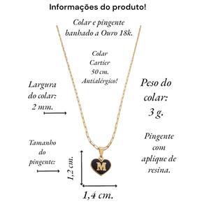 Colar feminino modelo Cartier com pingente Coração negro letra inicial M banhado em Ouro 18k. Delicado e cheio de significado, este colar apresenta um pingente em forma de coração, personalizado com a letra inicial. O colar perfeito para quem deseja manter alguém especial sempre perto do coração. Ideal para presentear ou para adicionar um toque pessoal ao seu estilo diário. Este colar banhado a Ouro é mais que um acessório; é uma declaração de amor. Especificações: Colar Cartier com pingente Coração Negro letra inicia M banhados em Ouro 18k. Tamanho do colar: 50 cm. Peso do colar: 3 g. Espessura do colar: 2 mm. Fecho do colar: lagosta. Antialérgico. Tamanho do pingente: 1,4 x 1,2 cm. Pingente banhado a Ouro com aplique de resina branca. Instruções de uso e conservação: Nossas peças são de excelente qualidade. Para manter o brilho e a beleza da joia; por favor siga estas dicas: Evite o uso da joia durante o banho, ter atenção ao aplique de cremes ou perfumes sobre a joia, evitar banho de piscina e mar com a joia; limpe-as sempre com flanela adequada, guarde-as separadamente. Com estes cuidados básicos a joia manterá sempre a originalidade e qualidade. Acompanha linda caixinha de presentes. sobre defeitos de fabricação: 6 meses. Seguindo nossas orientações de uso no certificado de , a joia permanecerá conservada por longos anos ou até décadas Marca: Anaisa Semijoias