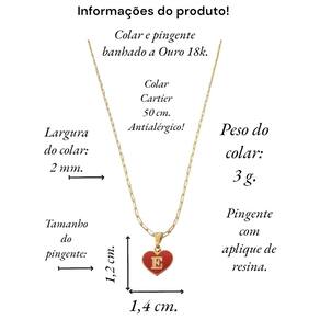 Colar feminino modelo Cartier com pingente Coração Vermelho letra inicial E banhado em Ouro 18k. Delicado e cheio de significado, este colar apresenta um pingente em forma de coração, personalizado com a letra inicial. O colar perfeito para quem deseja manter alguém especial sempre perto do coração. Ideal para presentear ou para adicionar um toque pessoal ao seu estilo diário. Este colar banhado a Ouro é mais que um acessório; é uma declaração de amor. Especificações: Colar Cartier com pingente Coração Vermelho letra inicia E banhados em Ouro 18k. Tamanho do colar: 50 cm. Peso do colar: 3 g. Espessura do colar: 2 mm. Fecho do colar: lagosta. Antialérgico. Tamanho do pingente: 1,4 x 1,2 cm. Pingente banhado a Ouro com aplique de resina branca. Instruções de uso e conservação: Nossas peças são de excelente qualidade. Para manter o brilho e a beleza da joia; por favor siga estas dicas: Evite o uso da joia durante o banho, ter atenção ao aplique de cremes ou perfumes sobre a joia, evitar banho de piscina e mar com a joia; limpe-as sempre com flanela adequada, guarde-as separadamente. Com estes cuidados básicos a joia manterá sempre a originalidade e qualidade. Acompanha linda caixinha de presentes. sobre defeitos de fabricação: 6 meses. Seguindo nossas orientações de uso no certificado de , a joia permanecerá conservada por longos anos ou até décadas Marca: Não Informado