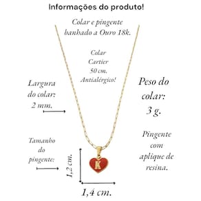 Colar feminino modelo Cartier com pingente Coração Vermelho letra inicial K banhado em Ouro 18k. Delicado e cheio de significado, este colar apresenta um pingente em forma de coração, personalizado com a letra inicial. O colar perfeito para quem deseja manter alguém especial sempre perto do coração. Ideal para presentear ou para adicionar um toque pessoal ao seu estilo diário. Este colar banhado a Ouro é mais que um acessório; é uma declaração de amor. Especificações: Colar Cartier com pingente Coração Vermelho letra inicia K banhados em Ouro 18k. Tamanho do colar: 50 cm. Peso do colar: 3 g. Espessura do colar: 2 mm. Fecho do colar: lagosta. Antialérgico. Tamanho do pingente: 1,4 x 1,2 cm. Pingente banhado a Ouro com aplique de resina branca. Instruções de uso e conservação: Nossas peças são de excelente qualidade. Para manter o brilho e a beleza da joia; por favor siga estas dicas: Evite o uso da joia durante o banho, ter atenção ao aplique de cremes ou perfumes sobre a joia, evitar banho de piscina e mar com a joia; limpe-as sempre com flanela adequada, guarde-as separadamente. Com estes cuidados básicos a joia manterá sempre a originalidade e qualidade. Acompanha linda caixinha de presentes. sobre defeitos de fabricação: 6 meses. Seguindo nossas orientações de uso no certificado de , a joia permanecerá conservada por longos anos ou até décadas Marca: Anaisa Semijoias