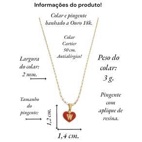 Colar feminino modelo Cartier com pingente Coração Vermelho letra inicial W banhado em Ouro 18k. Delicado e cheio de significado, este colar apresenta um pingente em forma de coração, personalizado com a letra inicial. O colar perfeito para quem deseja manter alguém especial sempre perto do coração. Ideal para presentear ou para adicionar um toque pessoal ao seu estilo diário. Este colar banhado a Ouro é mais que um acessório; é uma declaração de amor. Especificações: Colar Cartier com pingente Coração Vermelho letra inicia W banhados em Ouro 18k. Tamanho do colar: 50 cm. Peso do colar: 3 g. Espessura do colar: 2 mm. Fecho do colar: lagosta. Antialérgico. Tamanho do pingente: 1,4 x 1,2 cm. Pingente banhado a Ouro com aplique de resina branca. Instruções de uso e conservação: Nossas peças são de excelente qualidade. Para manter o brilho e a beleza da joia; por favor siga estas dicas: Evite o uso da joia durante o banho, ter atenção ao aplique de cremes ou perfumes sobre a joia, evitar banho de piscina e mar com a joia; limpe-as sempre com flanela adequada, guarde-as separadamente. Com estes cuidados básicos a joia manterá sempre a originalidade e qualidade. Acompanha linda caixinha de presentes. sobre defeitos de fabricação: 6 meses. Seguindo nossas orientações de uso no certificado de , a joia permanecerá conservada por longos anos ou até décadas