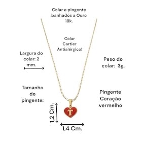 Colar feminino modelo Cartier com pingente Coração Vermelho letra inicial T banhado em Ouro 18k. Delicado e cheio de significado, este colar apresenta um pingente em forma de coração, personalizado com a letra inicial. O colar perfeito para quem deseja manter alguém especial sempre perto do coração. Ideal para presentear ou para adicionar um toque pessoal ao seu estilo diário. Este colar banhado a Ouro é mais que um acessório; é uma declaração de amor. Especificações: Colar Cartier com pingente Coração Vermelho letra inicia T banhados em Ouro 18k. Tamanho do colar: 60 cm. Peso do colar: 3 g. Espessura do colar: 2 mm. Fecho do colar: lagosta. Antialérgico. Tamanho do pingente: 1,4 x 1,2 cm. Pingente banhado a Ouro com aplique de resina branca. Instruções de uso e conservação: Nossas peças são de excelente qualidade. Para manter o brilho e a beleza da joia; por favor siga estas dicas: Evite o uso da joia durante o banho, ter atenção ao aplique de cremes ou perfumes sobre a joia, evitar banho de piscina e mar com a joia; limpe-as sempre com flanela adequada, guarde-as separadamente. Com estes cuidados básicos a joia manterá sempre a originalidade e qualidade. Acompanha linda caixinha de presentes. sobre defeitos de fabricação: 6 meses. Seguindo nossas orientações de uso no certificado de , a joia permanecerá conservada por longos anos ou até décadas