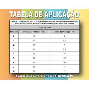 Colar Cervical Pet Med N° 5Colar protetor cervical Cães podem apresentar problemas de coluna em qualquer época da vida, principalmente quando idosos. A pet med oferece o colar protetor cervical confeccionado com tecido confortável. Uma alternativa para manter a imobilidade com muito conforto para o pet. Tudo para que a recuperação do seu amigo seja tranquila e sem estresse. Indicações Vale lembrar que a utilização do colar cervical requer orientação veterinária. Não deve ser utilizado como colar elisabetano, pois é específico para problemas cervicais. Instruções de uso: é fechado através de tiras autocolantesno dorso do animal. Atenção: para se obter o tamanho ideal, verifique a altura desde a base do pescoço até embaixo da orelha, além da circunferência do pescoço do animal. As referências de medidas de circunferência do pescoço e altura do pescoço são aproximadas, devido à variação acentuada do porte físico dos animais. Importante: supervisione o seu animal quando ele utilizar os colares protetores, pois cada animal reage de uma forma diferente. Embora a maioria dos animais não se incomode de usar os colares protetores, alguns poucos animais não se adaptam a quase nenhum acessório. Atenção: certifique-se de que os produtos estejam sempre secos, confortáveis e adequados ao tamanho do seu pet.