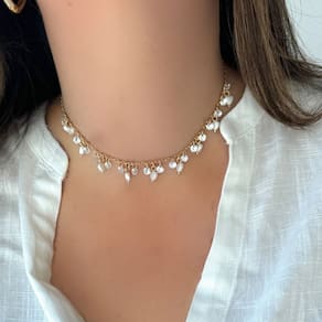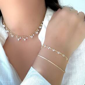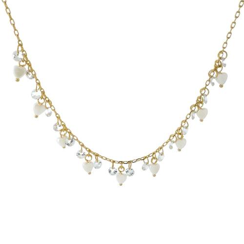 Choker Corações Madrepérola e Zircônias - Delicadeza Luminosa A Choker Corações Madrepérola e Zircônias é uma celebração do amor e da luz. Com corações de madrepérola que irradiam um brilho etéreo e zircônias que adicionam um toque de faísca, esta peça é a harmonia perfeita entre a natureza e o esplendor. A choker envolve o pescoço com elegância, enquanto os corações e as pedras preciosas se alternam em um baile de reflexos e charme. Perfeita para ocasiões especiais ou para adicionar um toque de sofisticação ao cotidiano, esta choker é um símbolo de delicadeza e beleza pura.